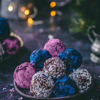 For inspiration, the treats pictured here are from Sculpted Kitchen, who makes plant-based recipes with beautiful artistic presentation. She names the cookies pictured first Holiday bliss balls, colored with rose, spirulina, and coconut shreds. As you search for new recipes, visit her page for healthy and delicious recipes.